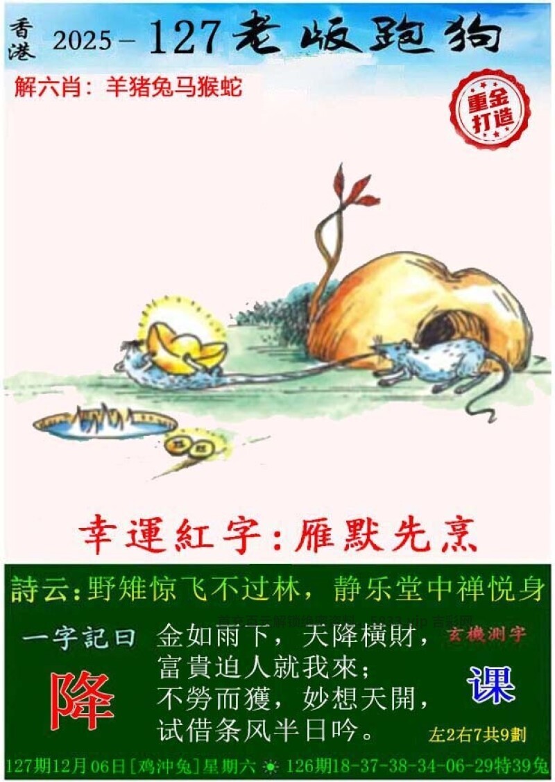 玄机詩雲:野雉惊飞不过林,静乐堂中禅悦身。金如雨下,天降橫財,富貴迫人就我來;不勞而獲,妙想天開,试借条风半日吟。